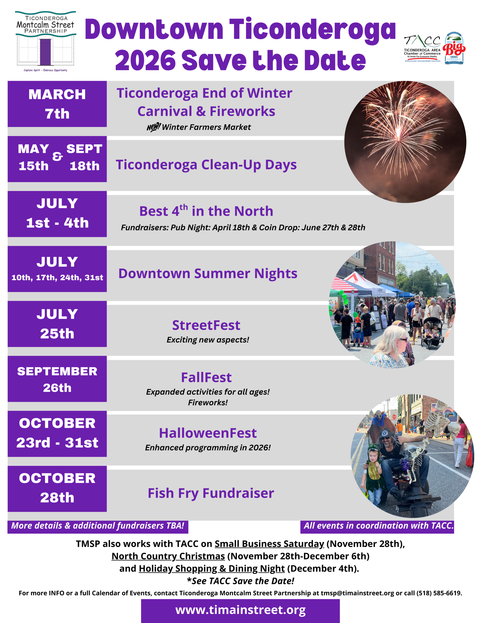 The Ticonderoga Montcalm Street Partnership (TMSP) has released its 2026 Save The Date, offering an early look at key TMSP events planned for the year ahead. The Save The Date serves as a helpful planning resource for businesses, residents, and visitors while highlighting the vibrant community events that bring energy, activity, and connection to Downtown Ticonderoga throughout the year. In 2026, TMSP will continue to support and host a variety of downtown events and initiatives designed to bring the community together and attract residents and visitors alike. Event committees are working diligently to enhance and expand each event, building on established...